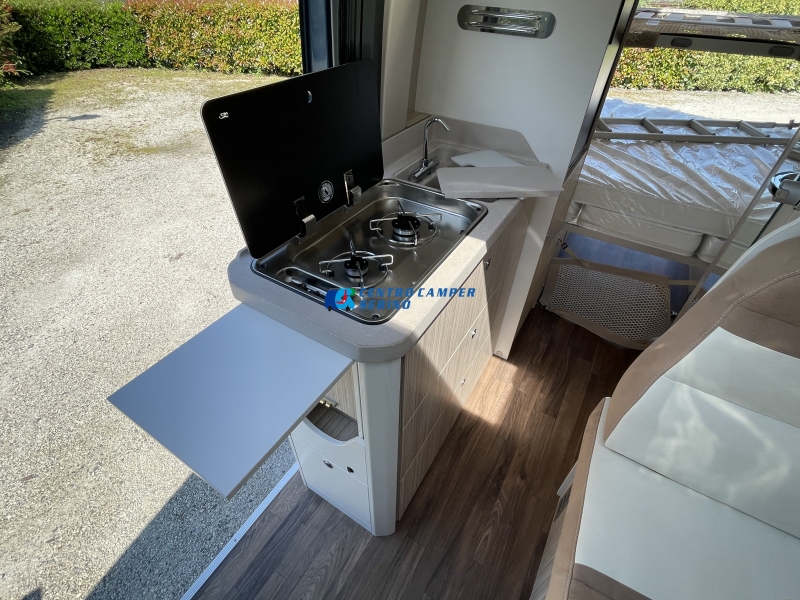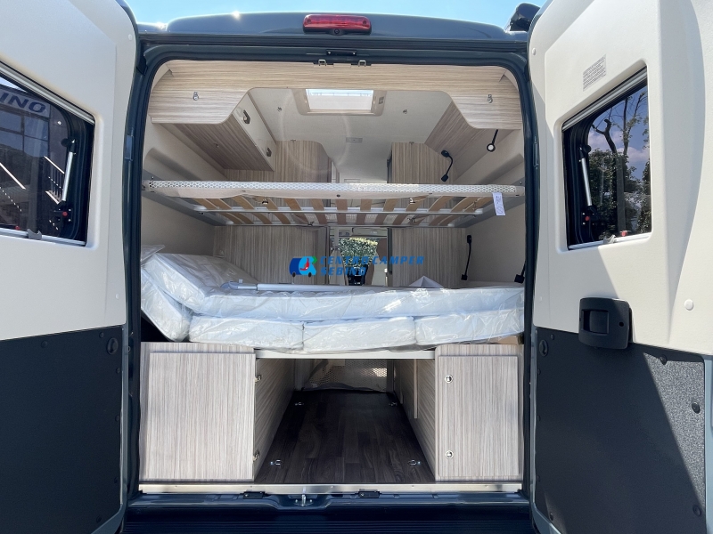 Camper Van 5,99 mt con 4 posti letto (doppio letto matrimoniale: letto matrimoniale a castello posteriore) e 4 posti viaggio omologati.