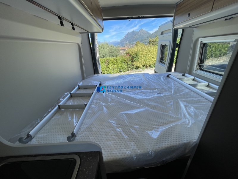 - Letto matrimoniale trasversale posteriore con rete a doghe rimovibile (per aumentare lo spazio di stivaggio), dimensioni: 197 x 157/149 cm c.a.