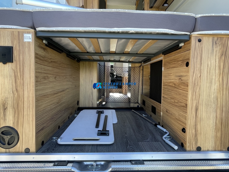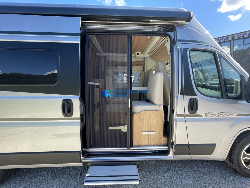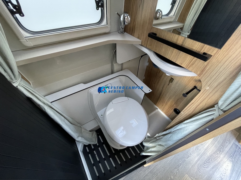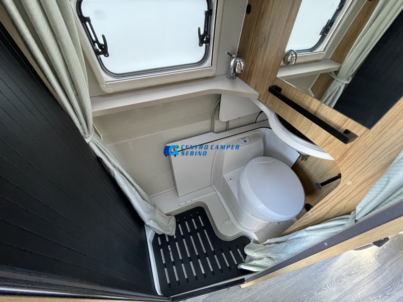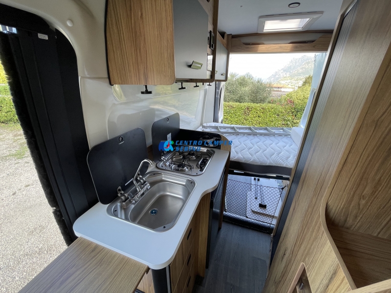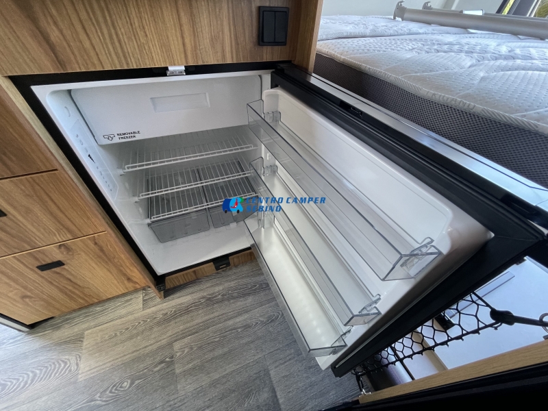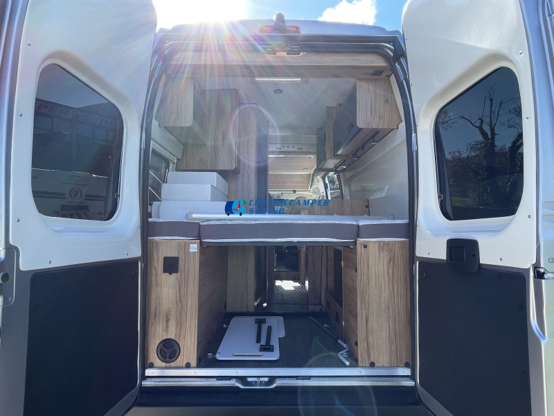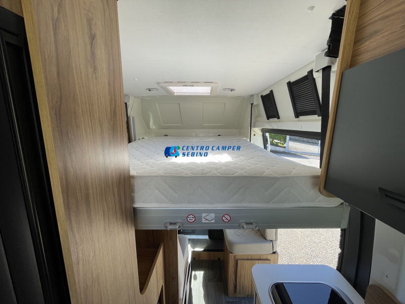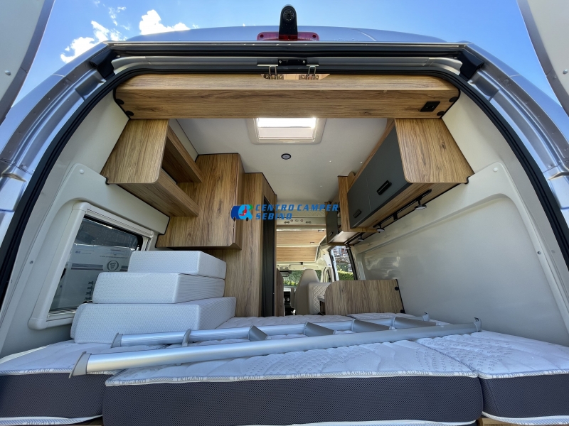 Van con 4 posti letto sempre pronti (doppio letto matrimoniale: letto matrimoniale trasversale posteriore amovibile per aumentare il volume di carico del garage e letto matrimoniale basculante anteriore elettrico + letto singolo ricavabile dalla dinette), bagno con doccia integrata e riscaldamento a Diesel.